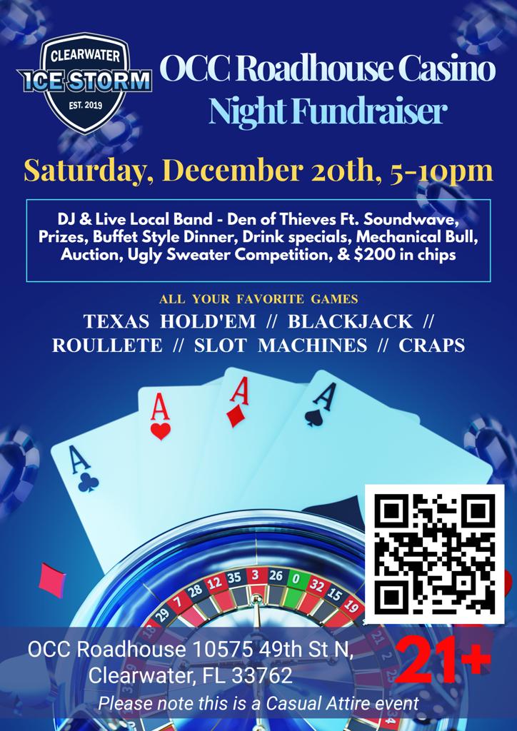 You are cordially invited to join us at the OCC Roadhouse for our inaugural Casino Night Fundraiser on December 20th from 5-10pm! Funds collected from this event will go towards ice time, tournament fees and scholarships for our Ice Storm players.